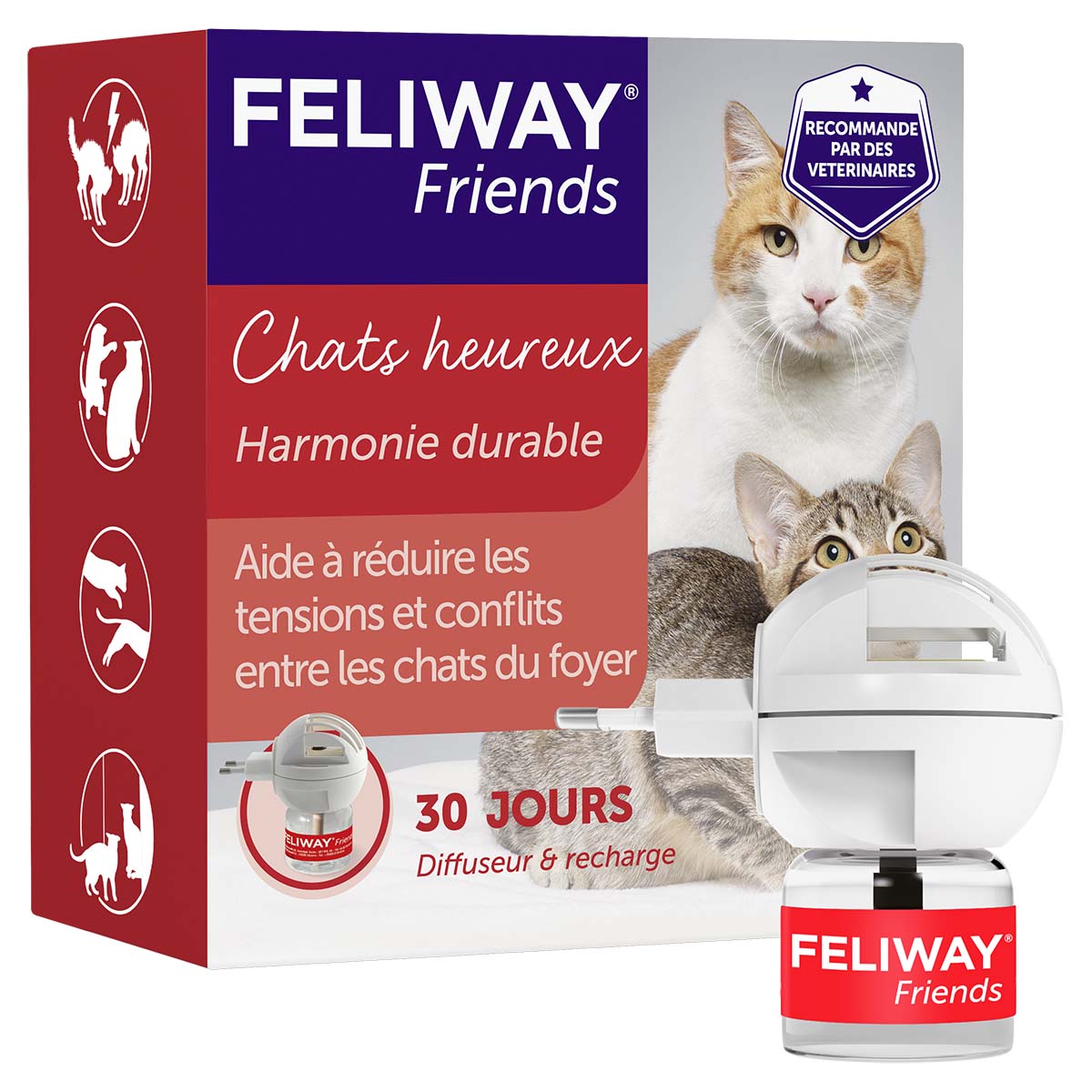 Les diffuseurs et les sprays FELIWAY® contiennent des messages apaisants qui imitent ou sont basés sur les substances chimiques naturelles que les chats libèrent pour marquer leur environnement comme étant sûr et sécurisé. Ces messages apaisants sont connus sous le nom de phéromones. Les produits FELIWAY® ne contiennent pas de médicaments ni de sédatifs, ce qui en fait une option totalement sûre pour rassurer et réconforter les chats.