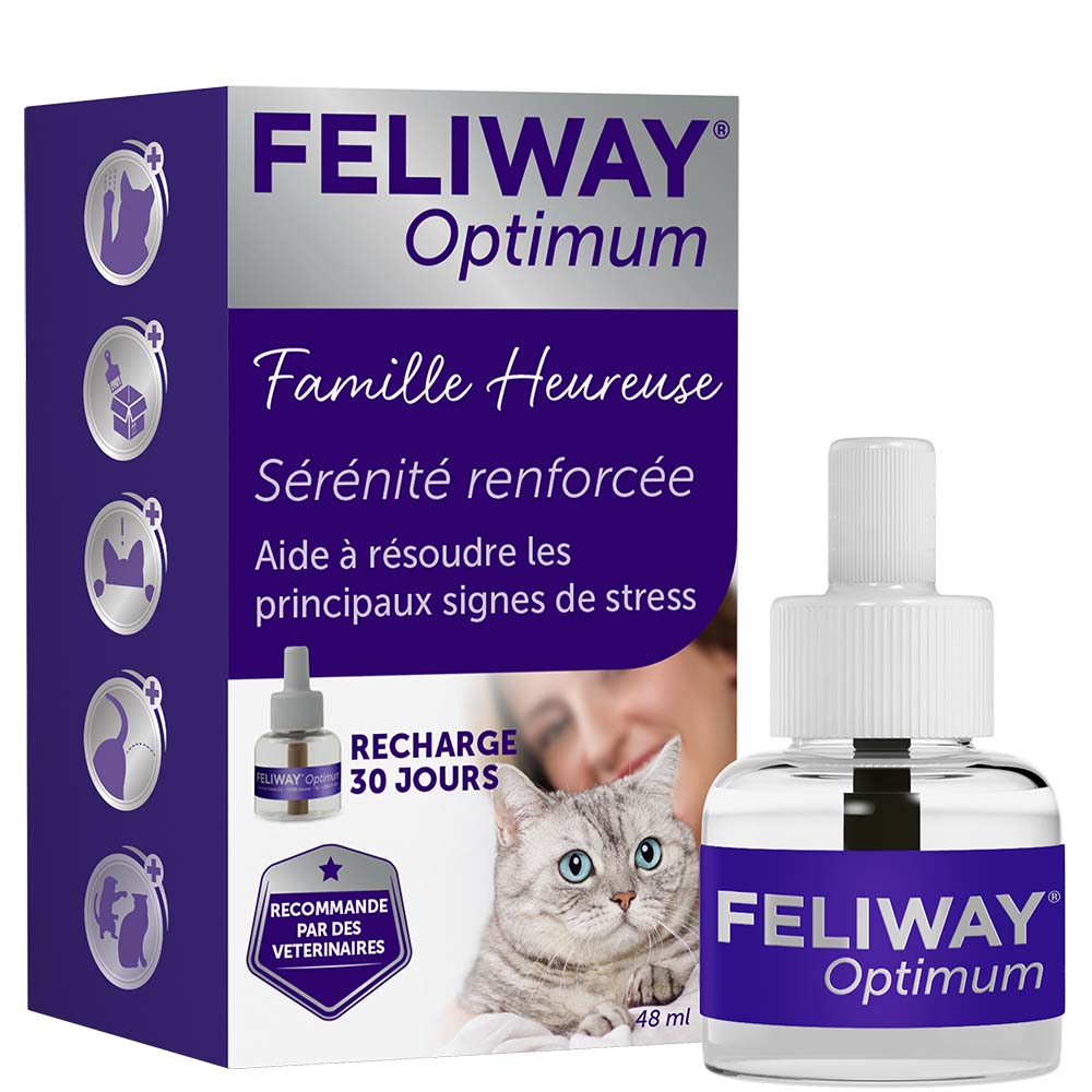 FELIWAY Optimum diffuse un message de sérénité renforcée. Chez la plupart des chats, FELIWAY Optimum pourra être utilisé de façon permanente dans le but de créer un environnement agréable au sein de votre foyer. L'utilisation minimale recommandée est de 1 mois.