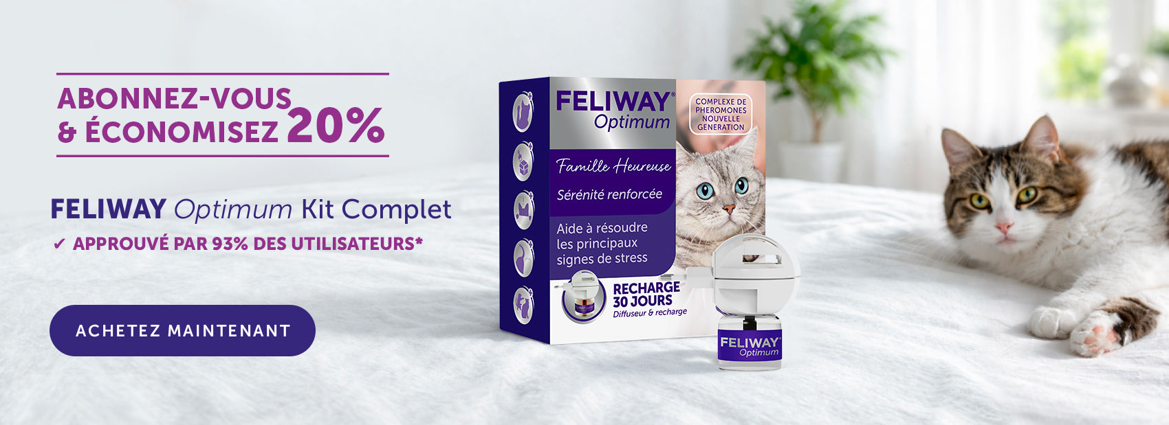 FELIWAY Optimum – notre solution apaisante la plus avancée, offrant une sérénité renforcée et réduisant davantage de signes de stress.