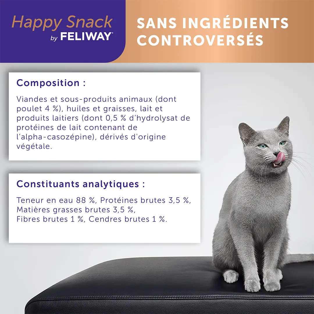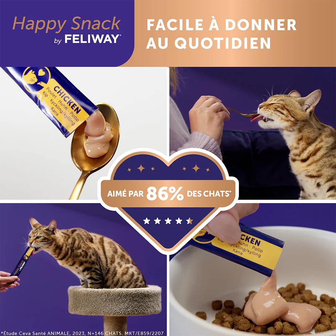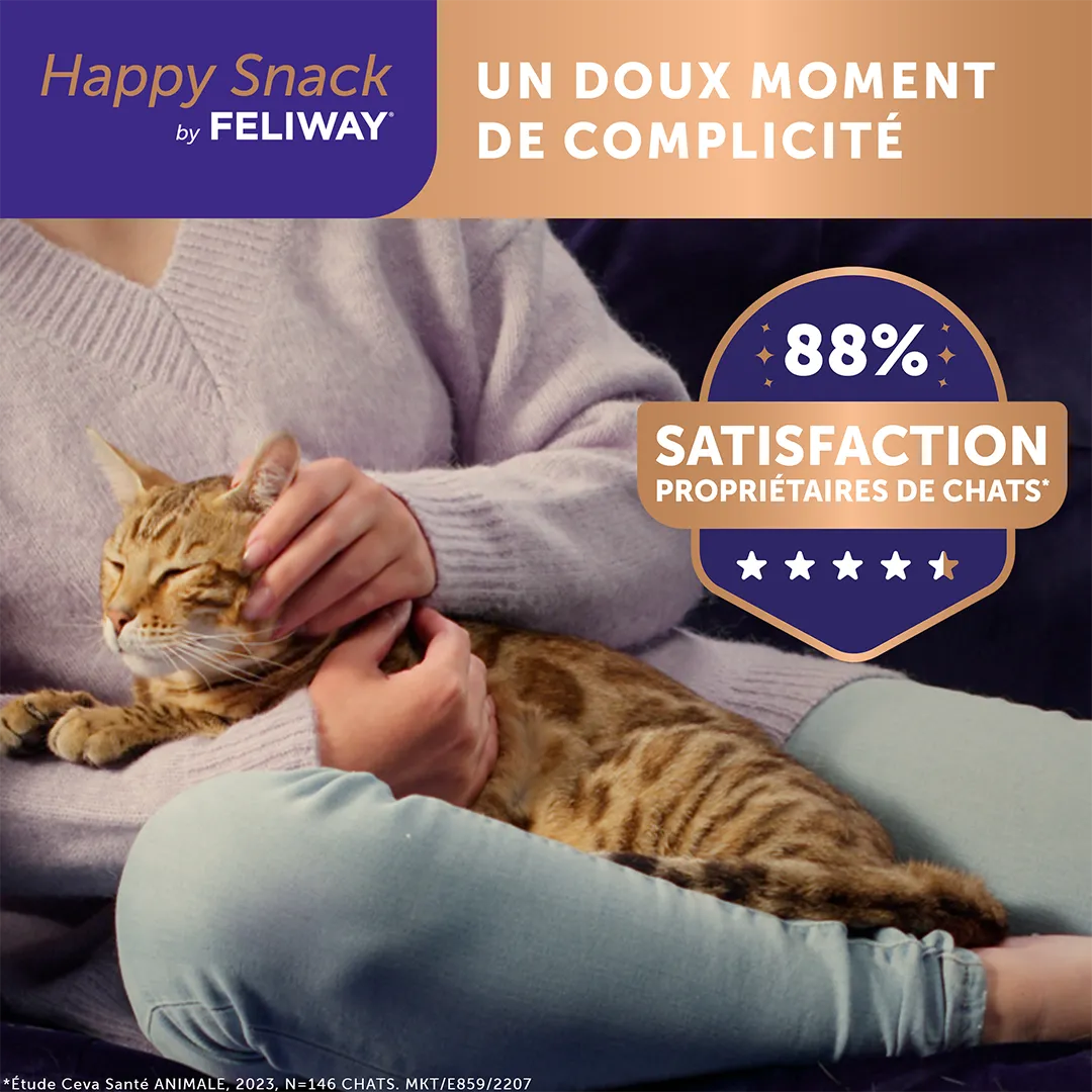 Happy Snack by FELIWAY est une friandise crémeuse et légère dans à lécher que les chats vont adorer. La dernière innovation de FELIWAY, leader du comportement félin avec plus de 25 ans de recherche sur le bien-être des chats.